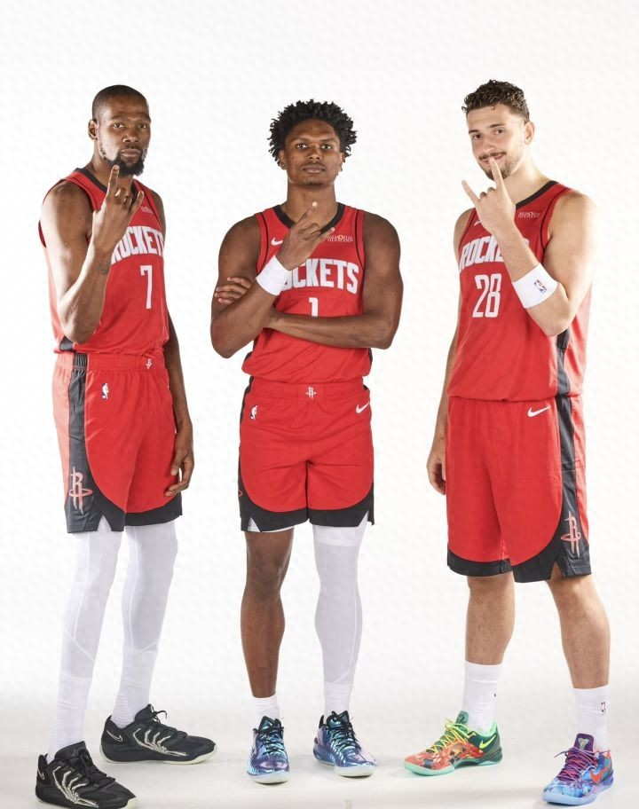 在季前赛上,乌度卡在第二场比赛中摆出了以阿门-汤普森、伊森、杜兰特、小贾巴里-史密斯、申京为主的五大首发阵容,这套阵容平均身高达2.08米,妥妥的联盟第一高,关键是这还没算亚当斯和卡佩拉。