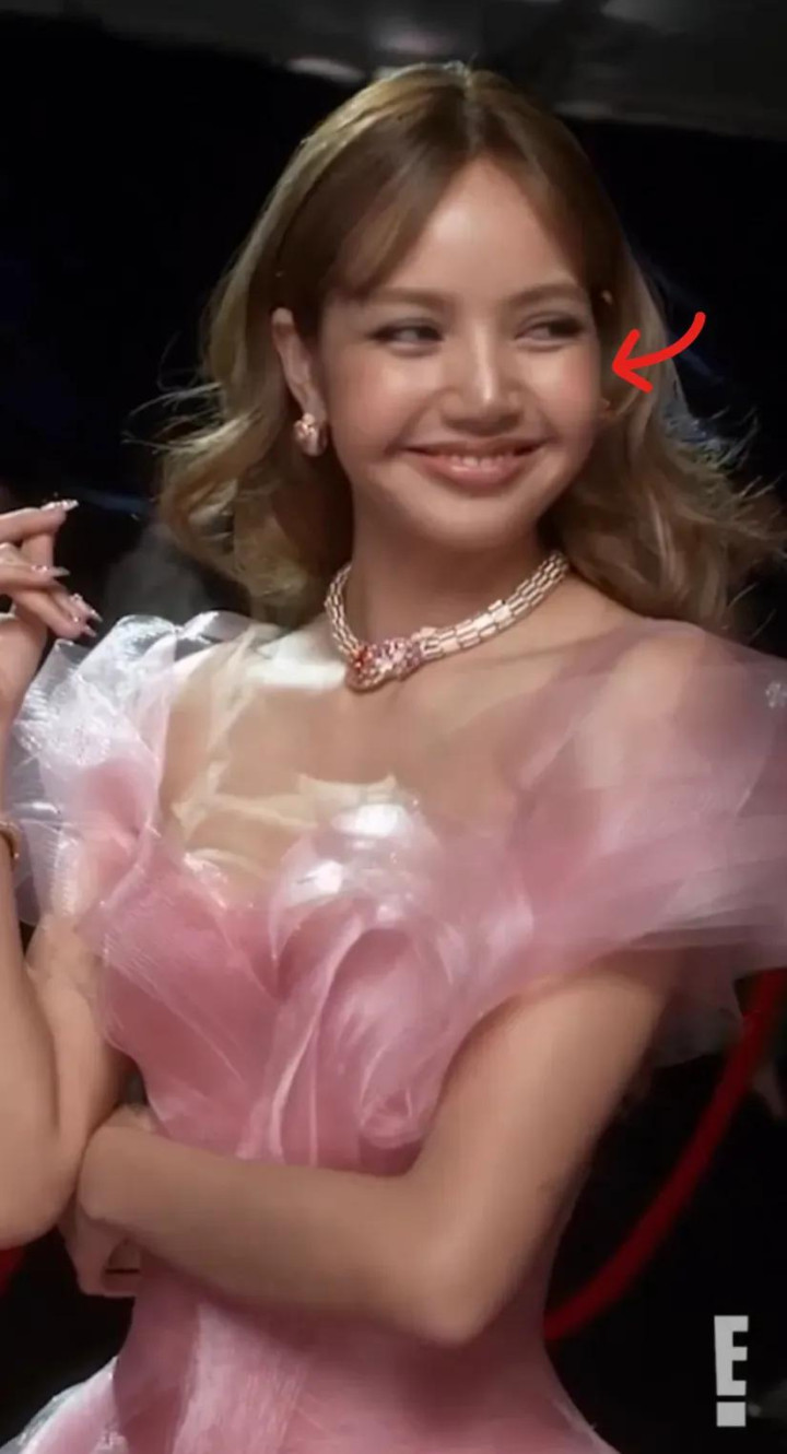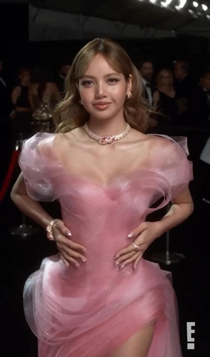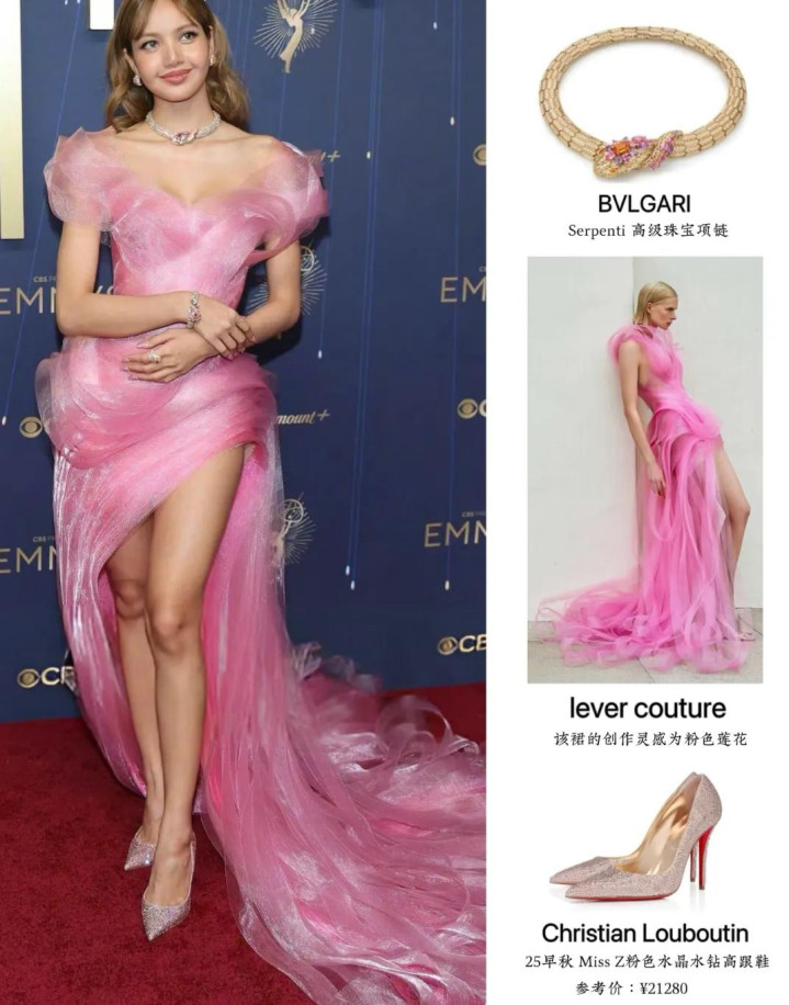Lisa选了一条以粉色莲花为设计灵感的裙子,材质是网纱,远观很朦胧梦幻,她整个人就像一朵娇艳欲滴的莲花,Lisa的审美很好。她脚上穿的是Christian Louboutin的粉色水钻尖头高跟鞋,与礼服颜色很相称。