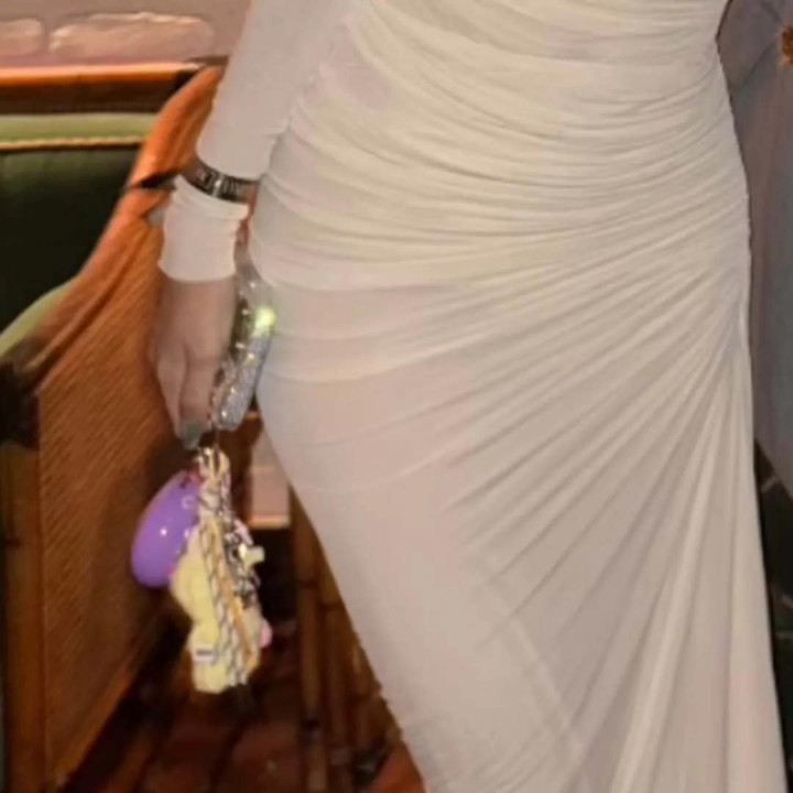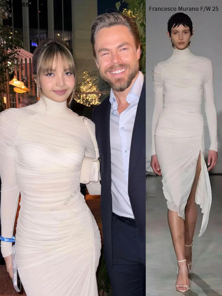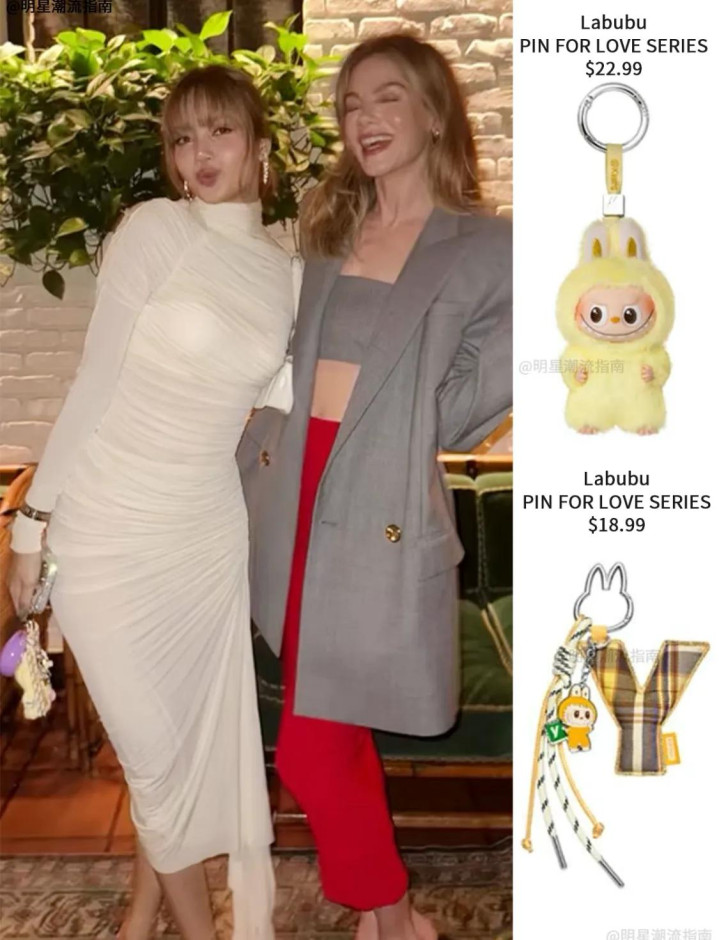 Lisa还去参加了艾美奖前举行的派对,她身穿一身紧身的白色连衣裙,身材曼妙引人注目。Lisa手里拿着一只新款的mini Labubu,她拿的是黄色的Labubu,Lisa喜欢黄色,这个黄色mini Labubu是她的新宠。