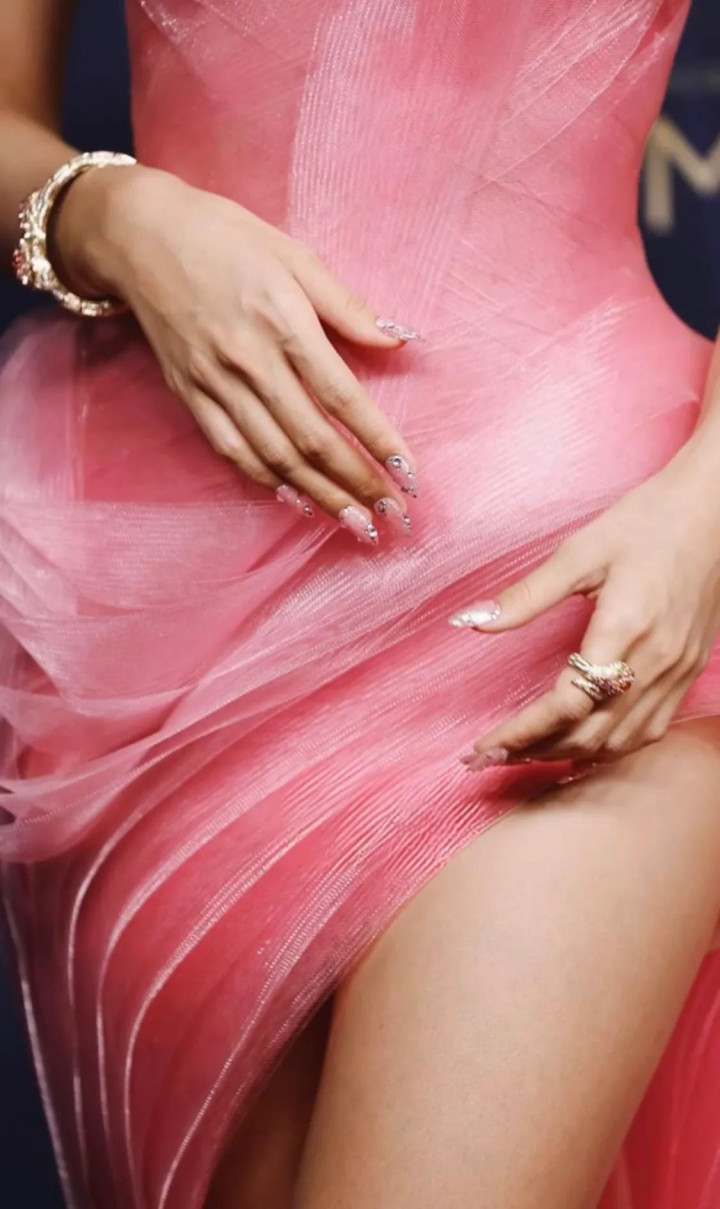 Lisa还特意为了艾美奖做了新的美甲,淡粉色镶嵌着水钻的美甲很浪漫,Lisa为了在红毯上抢风头下足了功夫。