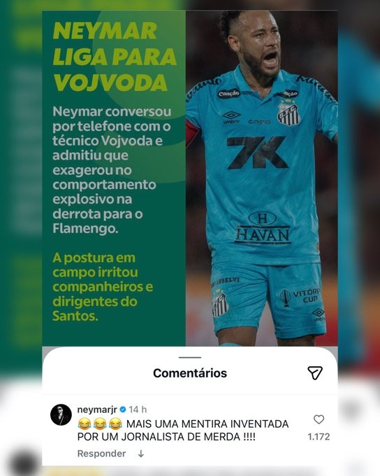 本轮巴甲联赛结束后,有媒体报道称内马尔曾主动联系主帅沃伊沃达,试图解释自己在比赛中的争议行为。对此,内马尔在ge新闻网Instagram推文评论区直接回应:“这又是某个垃圾记者编造的谎言。”