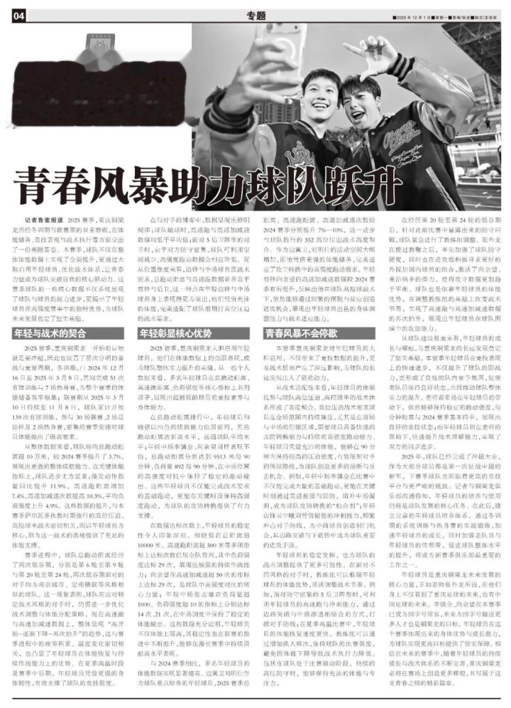 记者鲁蜜报道 2025赛季,重庆铜梁龙历经冬训期与联赛期的双重磨砺,在体能储备、竞技表现与战术执行等方面交出了一份亮眼答卷。本赛季,球队不仅在整体体能数据上实现了全面提升,更通过大胆启用年轻球员、优化战术体系,让青春力量成为球队突破自我的核心驱动力。这赛季球队的一些核心数据不仅系统呈现了球队与球员的战力进步,更揭示了年轻球员在高强度赛事中的独特优势,为球队未来发展奠定了坚实基础。